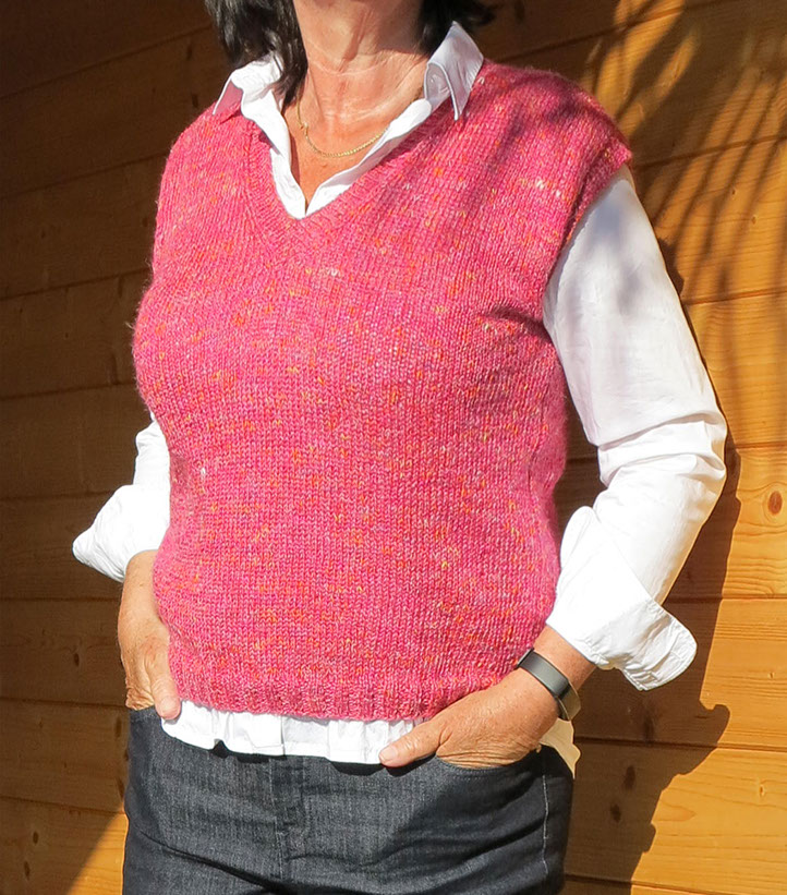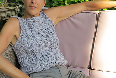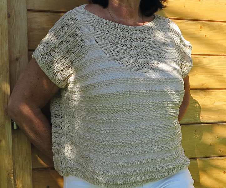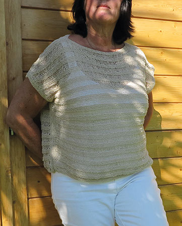 Débardeur en lin/coton avec aiguilles 4 mm. Encore en V. Peut se porter au-dessus d'un chemisier, T-shirt,... ou tout simplement comme petit dessus d'été.